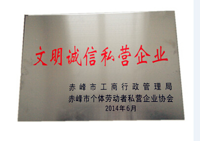2014年6月,公司被赤峰市工商行政管理局、赤峰市个体劳动者私营企业协会评为文明诚信私营企业,公司成为赤峰市级文明诚信私营企业。